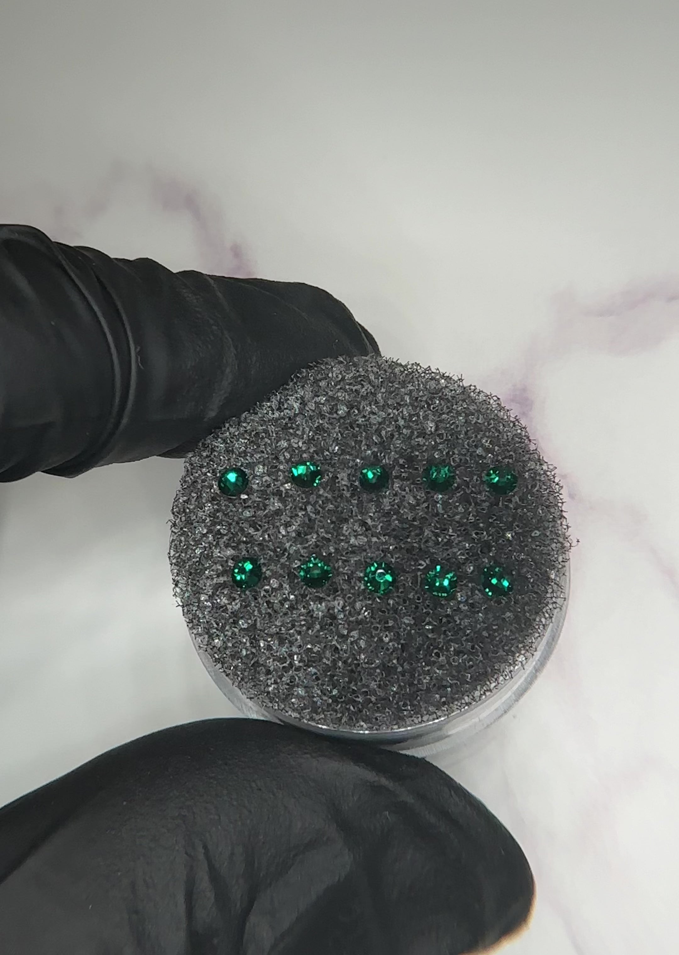 Las piedras Swarovski redondas en color Esmeralda son cristales con base plana, el color Esmeralda es un verde intenso y vibrante, a menudo descrito como brillante, con un toque de joya e intenso.