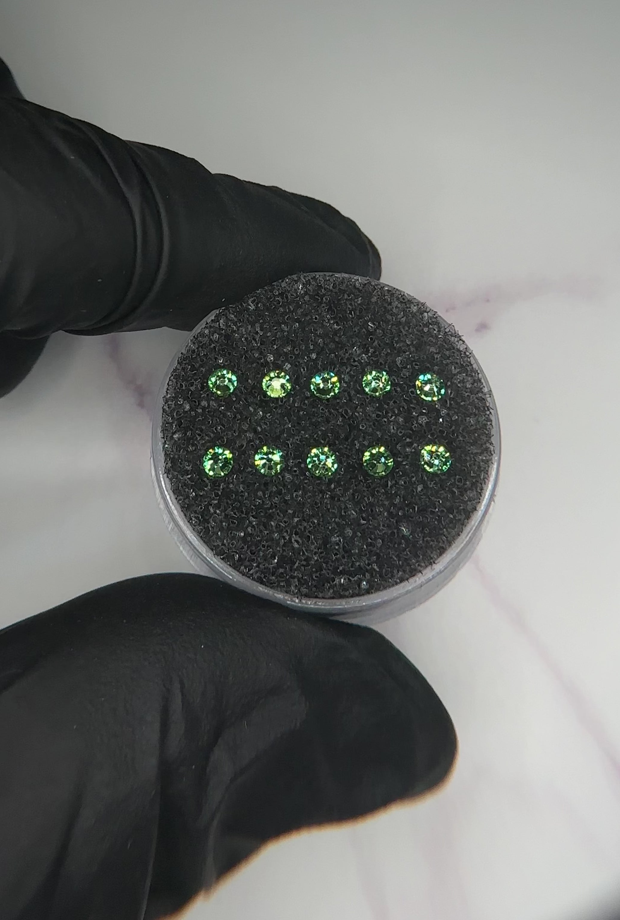 Las piedras de Swarovski redondas en color peridoto son cristales con base plana, el peridoto es una gema de color amarillo verdoso con un aspecto translúcido. Su color es similar al verde pálido de los brotes nuevos o la lima fresca.